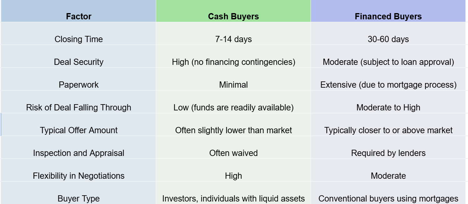 Key factors between cash buyers and financing buyers are compared to help you understand the pros and cons.