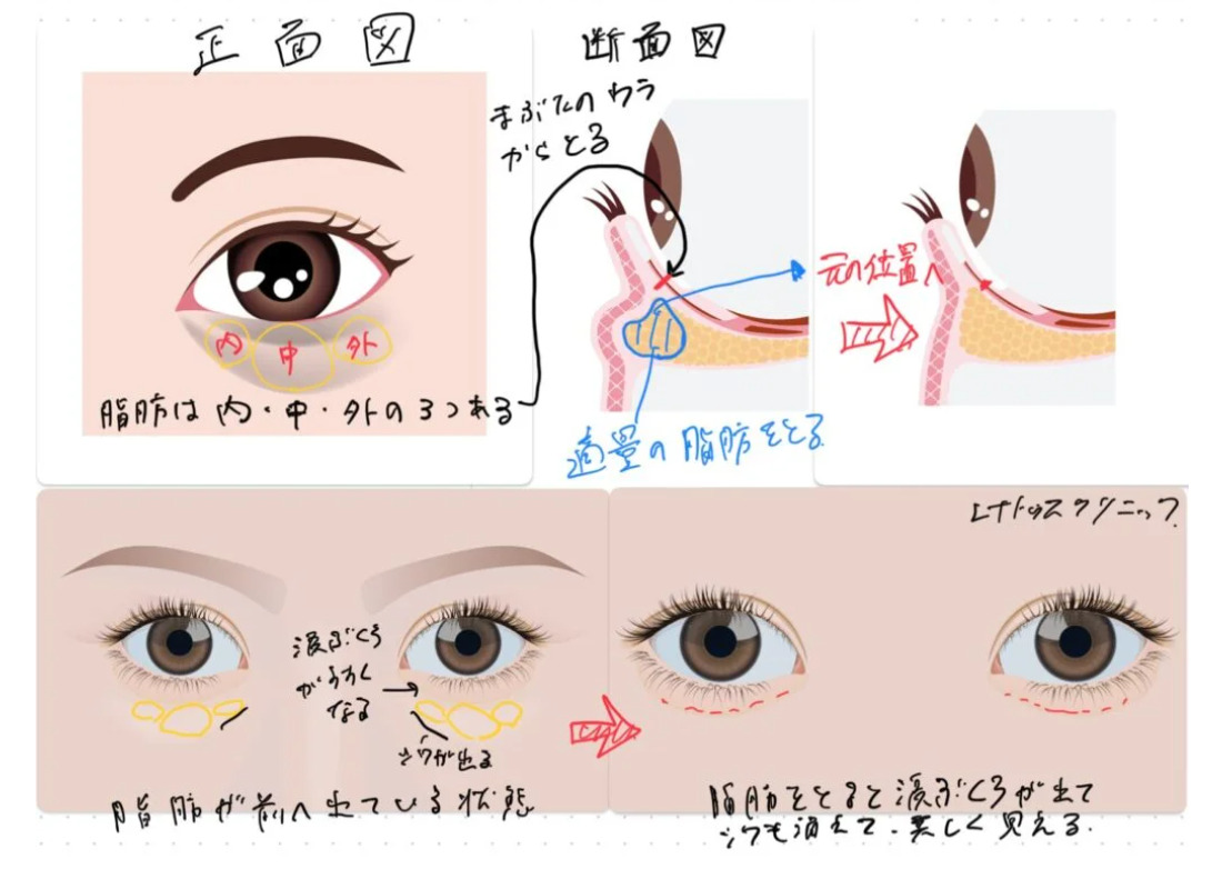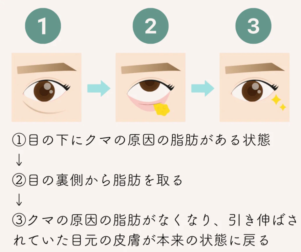 目の下の脂肪の量が適切な量になることで、眼窩脂肪で皮膚が押し出されてクマやたるみにみえていた皮膚が元の位置まで戻ることができます。