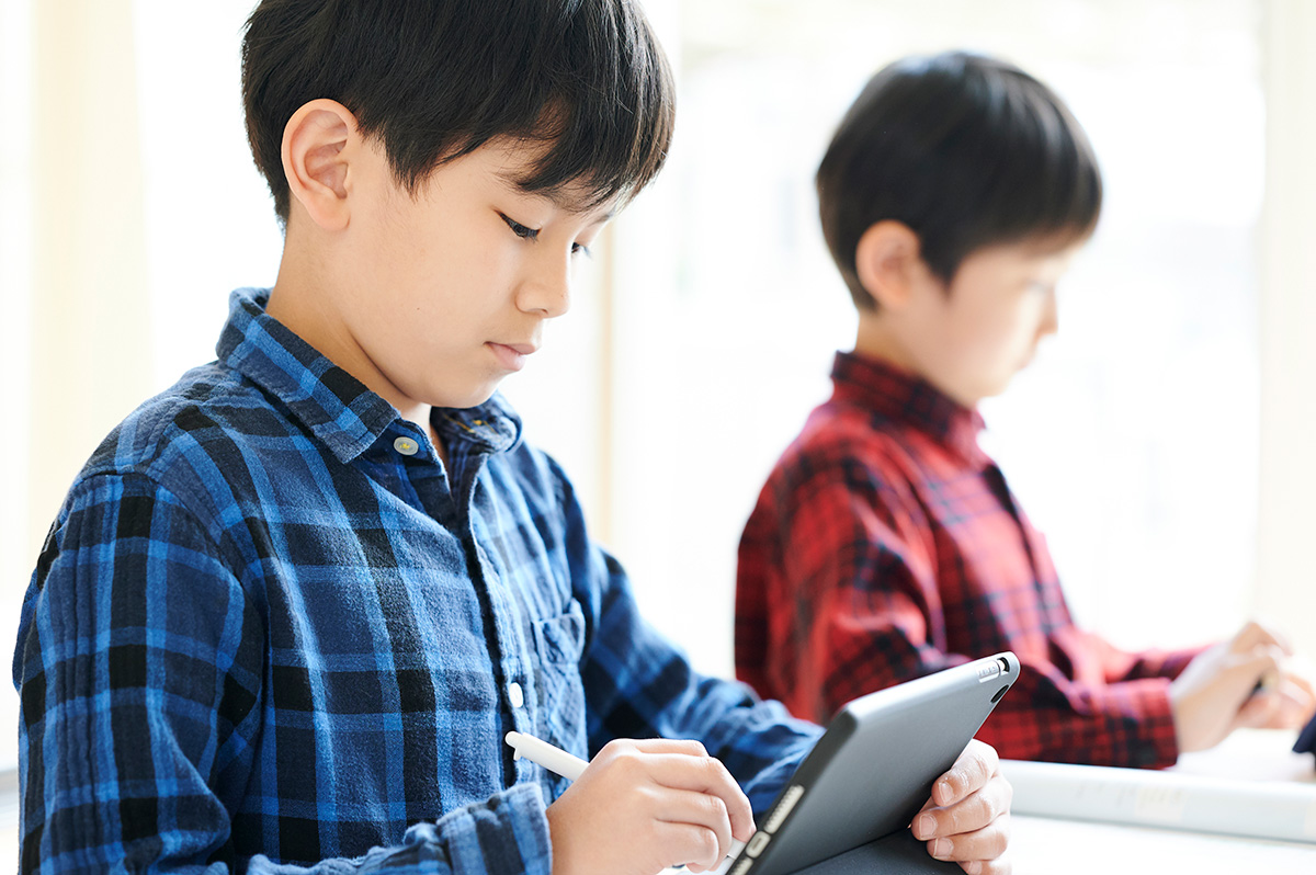 自立学習REDでは集団指導塾と個別指導塾のいいとこ取りをした「自立学習」という指導方法を取り入れています。他学年の他の生徒さんと同じ教室で授業を受けながら、タブレットを使って一人ひとりに合わせたカリキュラムで個別に学習していただくことができます。