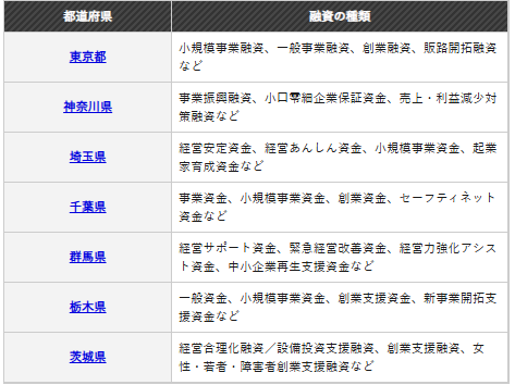 例として関東の中小企業制度融資の概要を載せておきます。全国の制度融資が一覧になっている公的機関のページはないので、お住いの地域の制度融資を調べてください。