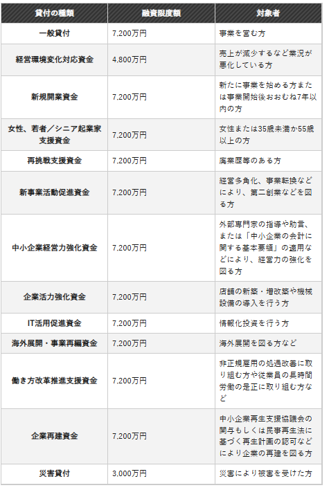 - 国民生活事業:個人企業や小規模企業向けの小口資金