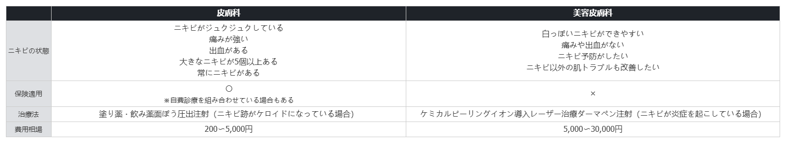 ニキビ治療で皮膚科と美容皮膚科のどちらに通うべきか迷う時は、ニキビの重症度や治療方法で判断します。