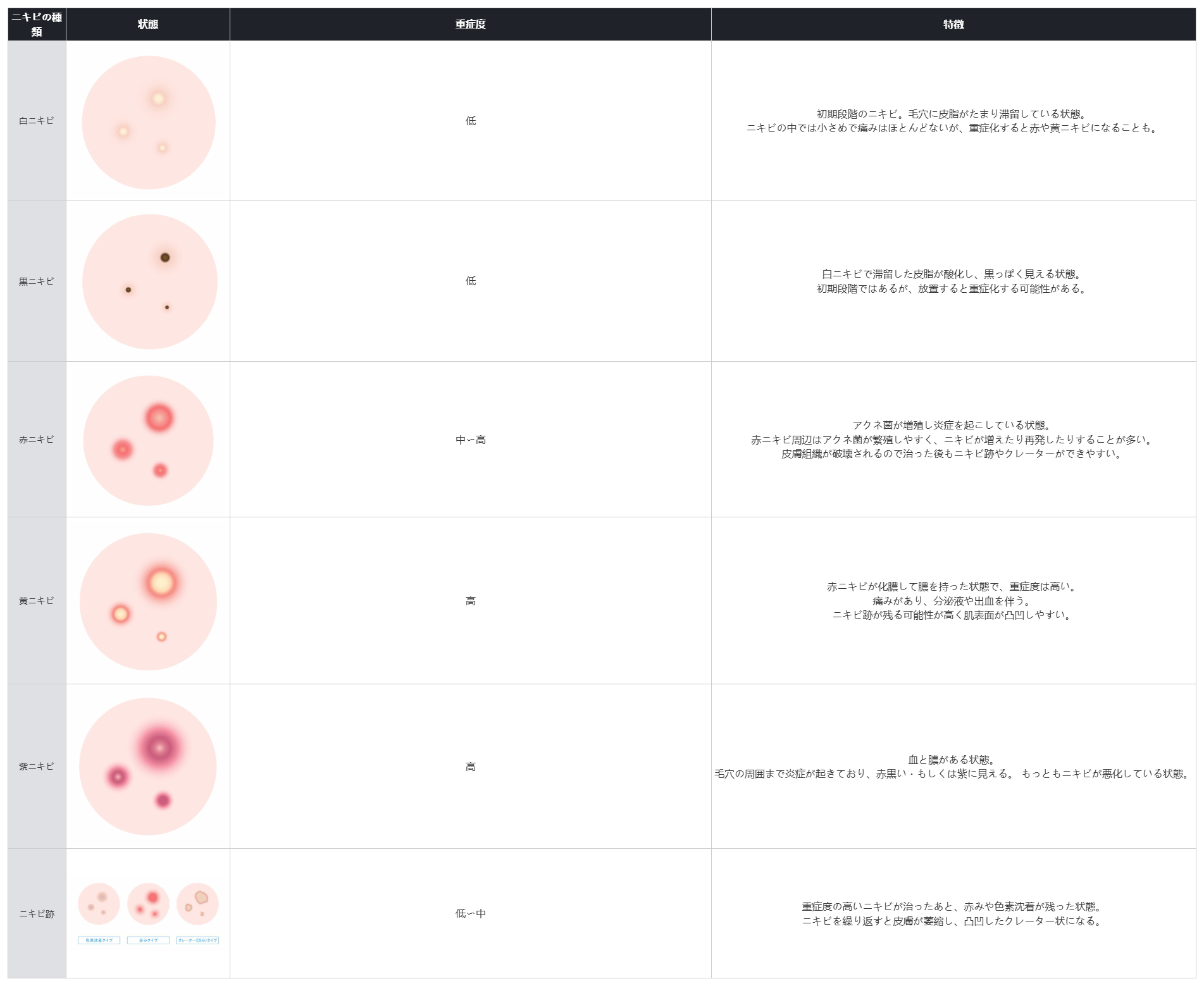 適切な治療を受けるには、まず自分のニキビがどのタイプに該当するかをチェックしましょう。下記の表はニキビの種類をまとめたものです。