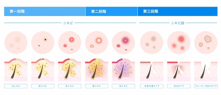 ニキビにはいくつか種類があり、段階的に症状が進んでいきます。