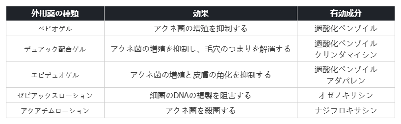 ニキビ治療で処方される外用薬には次の種類があります。
