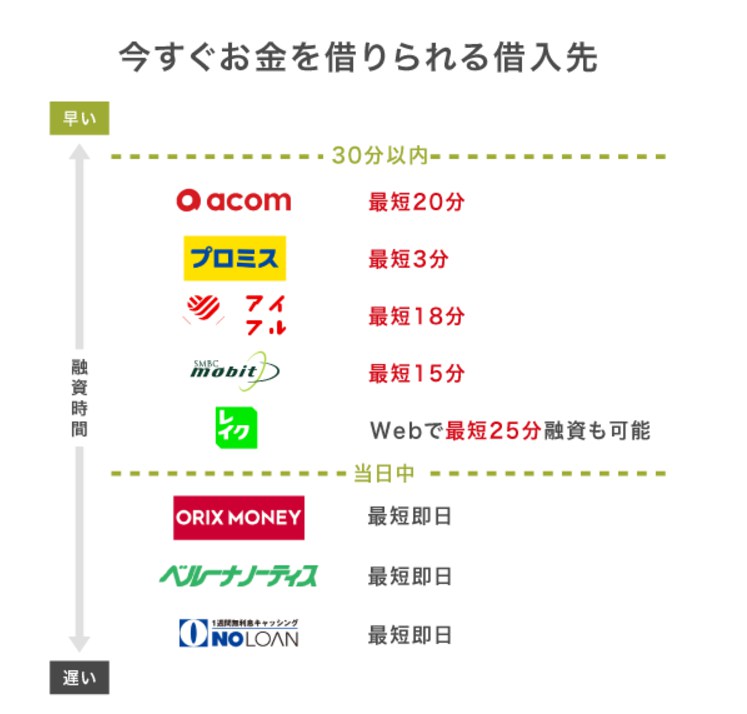 例えば今すぐお金を借りたい時は、即日融資に対応している消費者金融のなかでも対応が早く、最短20分融資が可能なアコムを選ぶとすぐに現金を受け取れます。