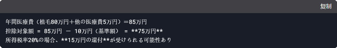 植毛手術は自由診療ですが、**医療費控除**の対象になる可能性があります。