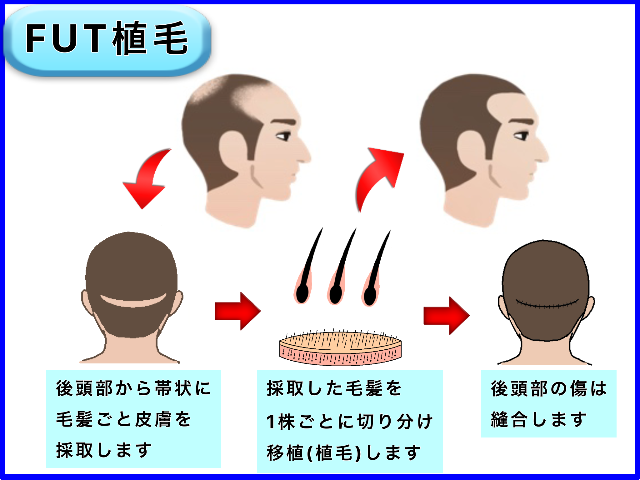 - 後頭部の皮膚を切り取り、毛根を移植