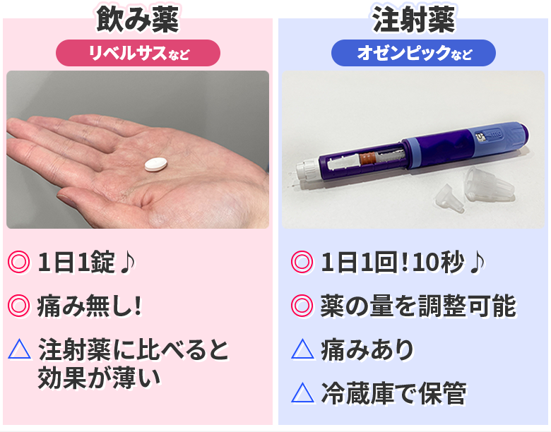 大きく分けるとビクトーザ、サクセンダ、リベルサス、オゼンピックの4種類があります。当院では、主にビクトーザを使用しています。ちなみにビクトーザとサクセンダ(ダイエット用としての名称)は全く同じ薬です。