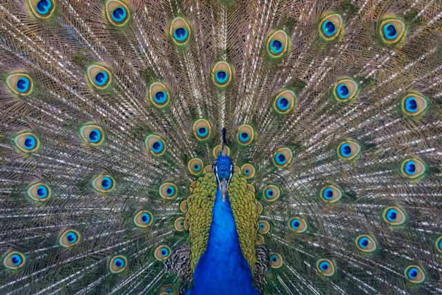 孔雀尾羽的結構特殊,可確保每當孔雀展開時,它們就會露出每一個明亮的眼孔。這是透過將多層羽毛組合在一起來實現的,稱為上尾蓋[來源:國家動物園]。肉眼看來,單眼呈現不同深淺的藍色和綠色,但實際上,羽毛纖維具有黑色素。這些纖維內奈米顆粒的不同角度捕捉並反射陽光,產生虹彩[來源:Milius]。