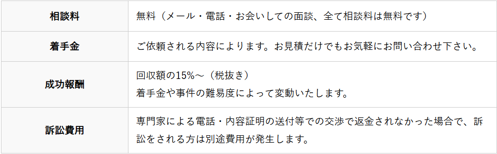 少しでも多くの方が少しでも気軽に法律の専門家に依頼し、詐欺の被害金を取り戻せるよう費用面でも最大限の努力をしておりますので、ご相談やお見積など気兼ねなくお気軽にご相談ください。