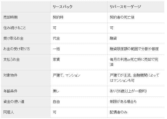 まず、一番の違いは「売却時期」です。リースバックの場合は、不動産会社等と契約した際に自宅の売却が行われます。一方、リバースモーゲージは契約者(または契約者が死亡後、契約を引き継いだ配偶者)が亡くなった後、残債の返済のために売却されます。