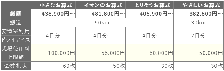 おもな葬儀社の家族葬プランについては次の表の通りです。葬儀社によって、プランに含まれている内容や追加費用が異なります。
