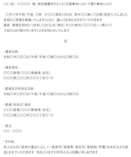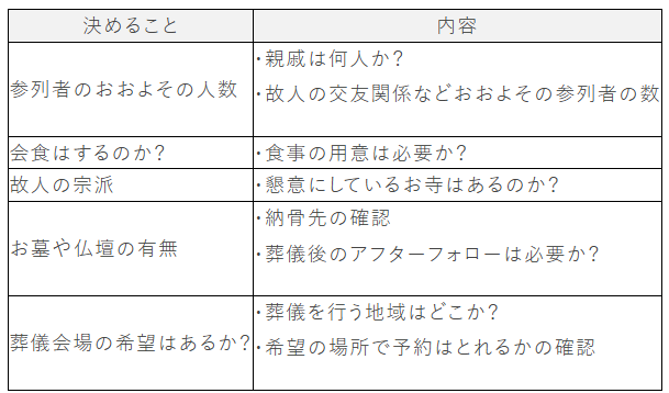 日程や場所がすべて決まれば、参列してもらいたい方に向けて訃報の案内をします。内容については次の表をご参照ください。