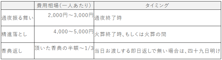 通夜振る舞い・精進落としなどの会食費、香典返しなどの返礼品にかかる費用です。