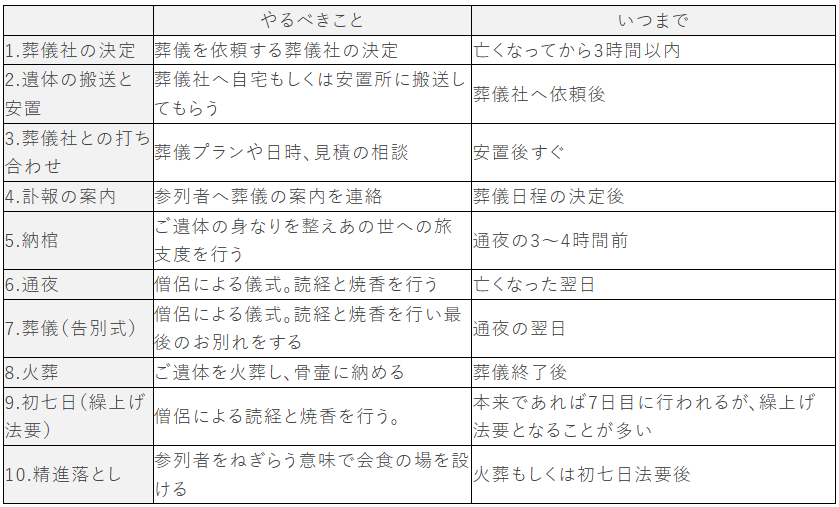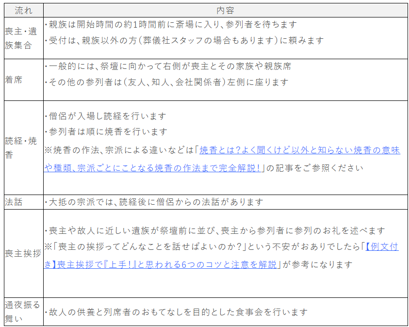 通夜は基本的に告別式の前夜に実施されます。通夜の流れについては、次の表をご参照ください。
