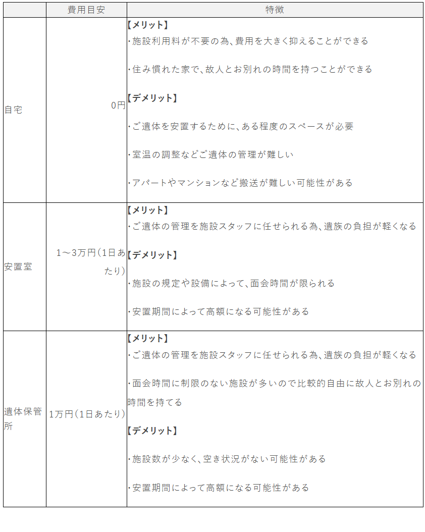 ご遺体の安置については自宅もしくは葬儀社の安置室、民間業者の遺体保管場所となります。