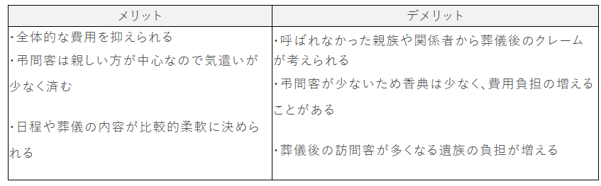 家族葬で葬儀をあげる際に考えられるメリットとデメリットは、次の表の通りです。