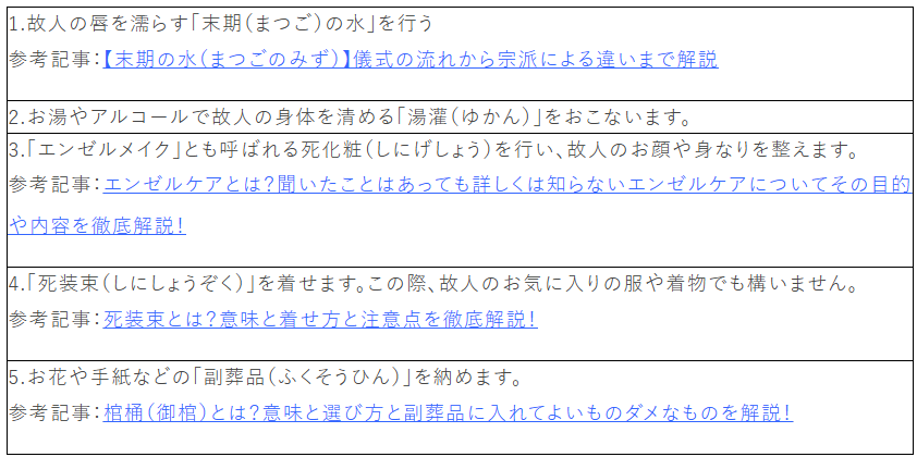 納棺のしきたりやマナーなどを知りたい方は、「納棺とは?意味・流れ・入れるもの・マナーを完全解説!」の記事をご参照いただければ、納棺時に入れてはいけないものなどの詳細がわかります。